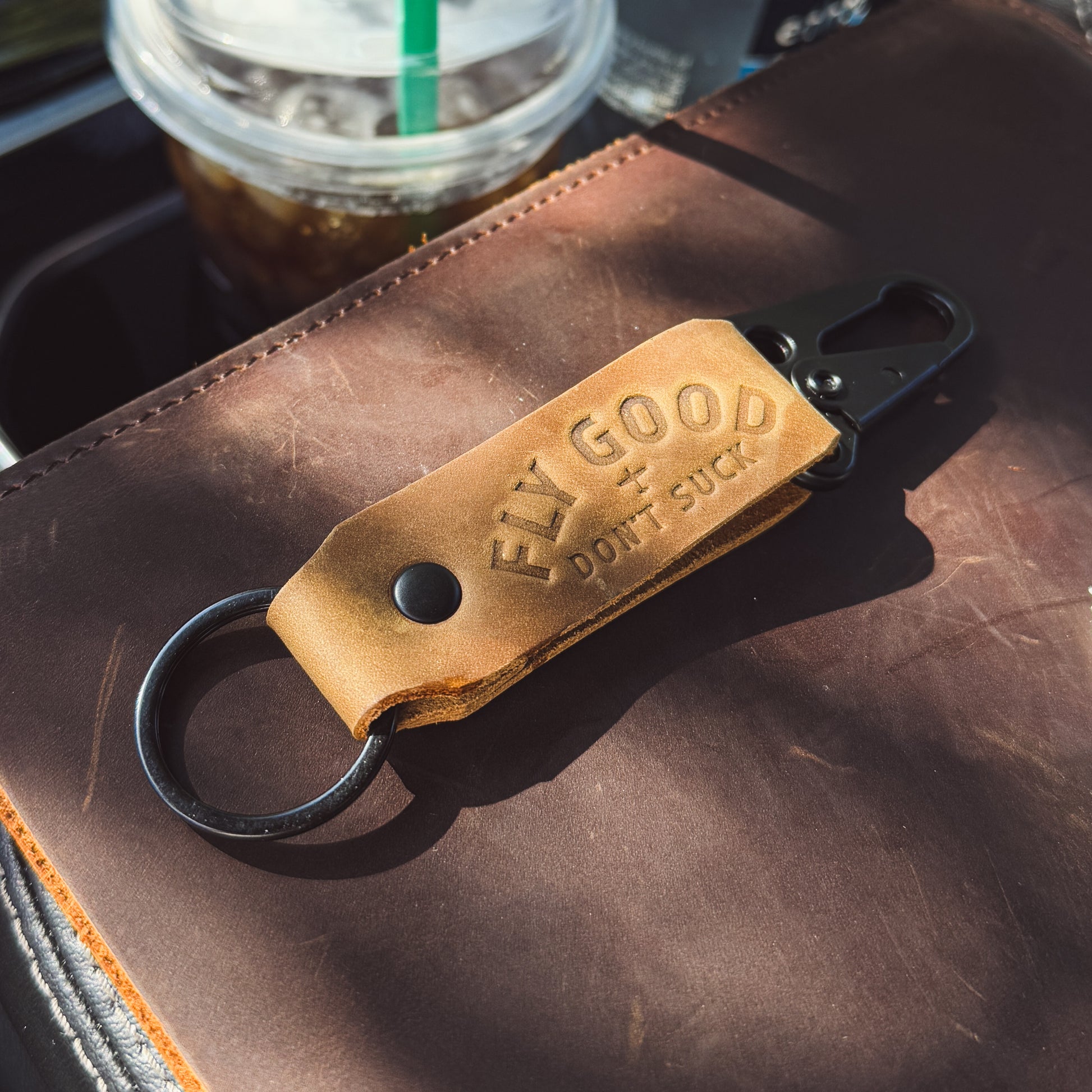Crafted from premium leather, this soft tan leather & black keychain features our iconic Fly Good Don't Suck phrase stamped into the surface. With matte black metal hardware on both ends, one side boasts a trigger snap clip, perfect for securing to your flight bag or any desired location. On the opposite end, attach your keys to the sturdy o-ring.
